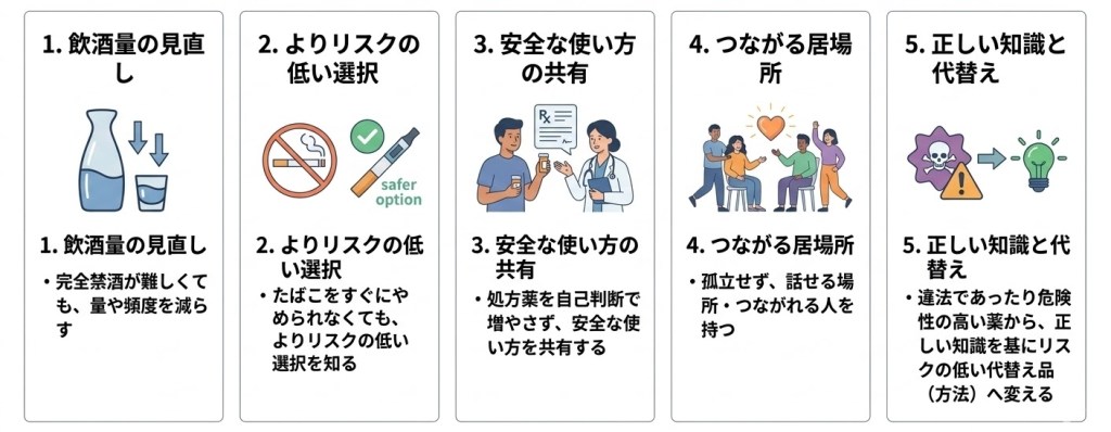「やめなければならない」「完全に断つべきだ」という理想だけを押しつけるのではなく、今この瞬間を生きている人の安全・健康・尊厳を最優先することを目的としています。